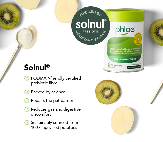 Solnul® is a FODMAP-friendly certified prebiotic fibre, sustainably sourced from 100% upcycled potatoes. Scientifically shown to support the repair of the intestinal gut barrier for overall gut health, it nourishes specific beneficial bacteria—Bifidobacterium and Akkermansia—associated with healthy bowel function. It also supports digestion while helping to reduce gas and discomfort.